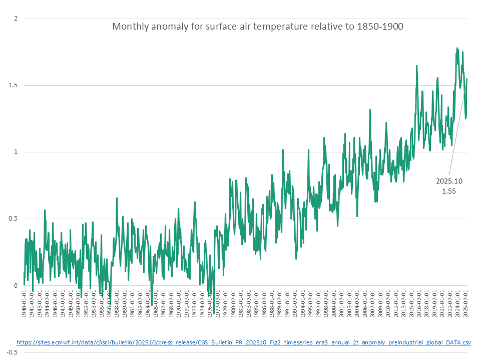 According to the Copernicus Climate Change Service (C3S), October 2025 will be the third-warmest October on record globally, with an average surface temperature of 15.14°C, 1.55°C higher than the estimated pre-industrial average from 1850 to 1900. It will be the first time since April 2025 that the temperature has exceeded 1.50°C. 2025 is almost certain to be either the second or third warmest year on record.