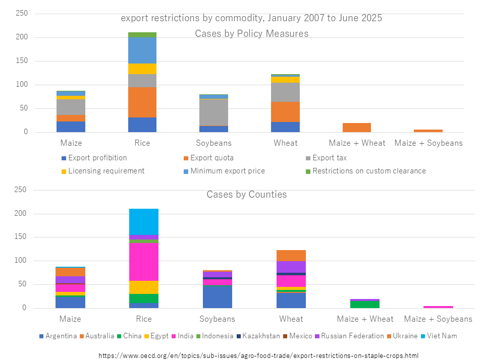 The OECD and the Agricultural Market Information System (AMIS) have tracked export restrictions on major crops (maize, rice, soybeans, and wheat) going back to January 2007. A recent OECD report, based on the latest database update, analyzed export restriction trends from January 2024 to June 2025.
