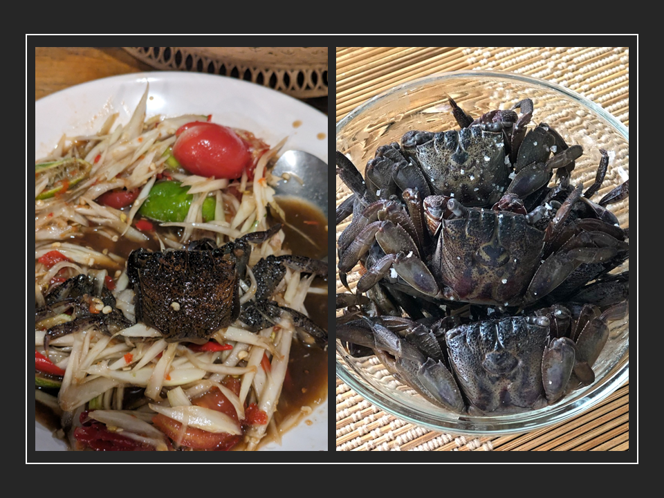 According to various sources, the crabs are generally not eaten because they are slightly crushed, allowing their essence and aroma to dissolve into the Som Tum sauce (many people also choose not to eat them for hygiene and safety reasons). However, when I actually tried them, the crab meat was sweet and delicious.