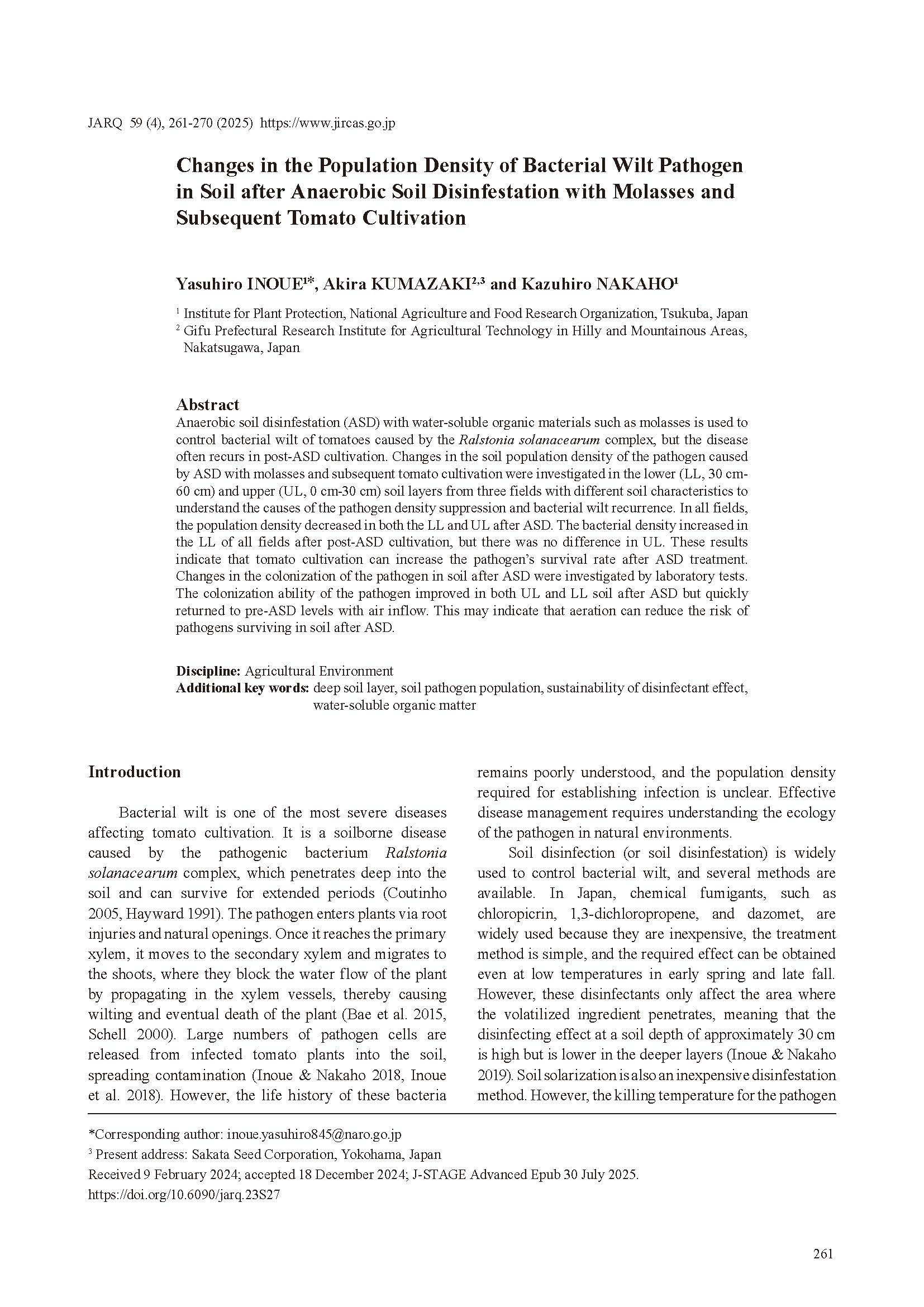 Anaerobic soil disinfestation (ASD) with water-soluble organic materials such as molasses is used to control bacterial wilt of tomatoes caused by the Ralstonia solanacearum complex, but the disease often recurs in post-ASD cultivation. Changes in the soil population density of the pathogen caused by ASD with molasses and subsequent tomato cultivation were investigated in the lower (LL, 30 cm- 60 cm) and upper (UL, 0 cm-30 cm) soil layers from three fields with different soil characteristics to understand the causes of the pathogen density suppression and bacterial wilt recurrence. In all fields, the population density decreased in both the LL and UL after ASD. The bacterial density increased in the LL of all fields after post-ASD cultivation, but there was no difference in UL. These results indicate that tomato cultivation can increase the pathogen’s survival rate after ASD treatment. Changes in the colonization of the pathogen in soil after ASD were investigated by laboratory tests. The colonization ability of the pathogen improved in both UL and LL soil after ASD but quickly returned to pre-ASD levels with air inflow. This may indicate that aeration can reduce the risk of pathogens surviving in soil after ASD.