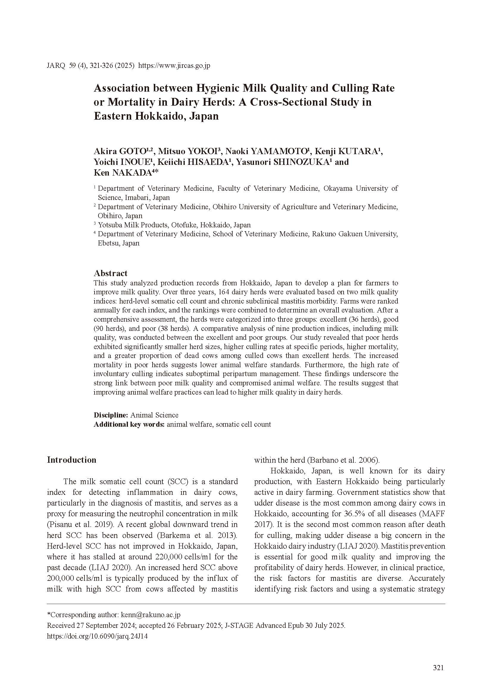 Association between Hygienic Milk Quality and Culling Rate or Mortality in Dairy Herds: A Cross-Sectional Study in Eastern Hokkaido, Japan