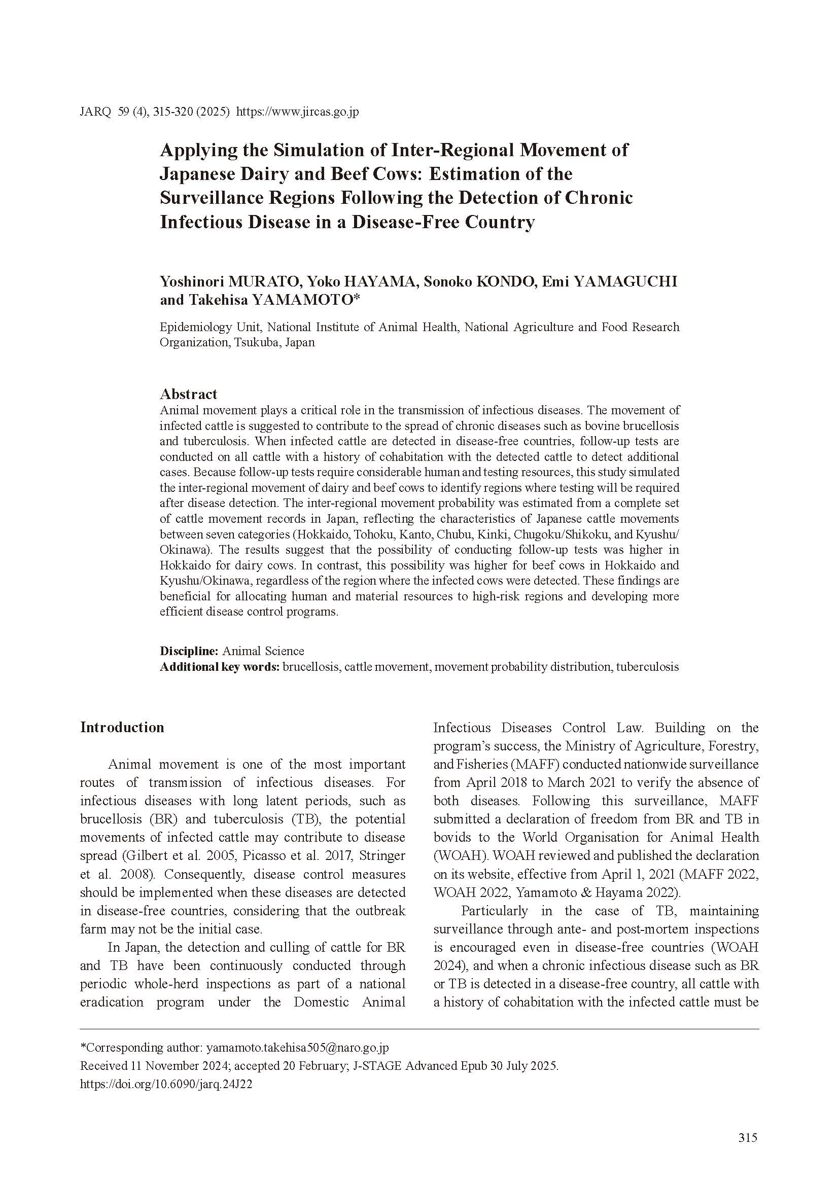 Animal movement plays a critical role in the transmission of infectious diseases. The movement of infected cattle is suggested to contribute to the spread of chronic diseases such as bovine brucellosis and tuberculosis. When infected cattle are detected in disease-free countries, follow-up tests are conducted on all cattle with a history of cohabitation with the detected cattle to detect additional cases. Because follow-up tests require considerable human and testing resources, this study simulated the inter-regional movement of dairy and beef cows to identify regions where testing will be required after disease detection. The inter-regional movement probability was estimated from a complete set of cattle movement records in Japan, reflecting the characteristics of Japanese cattle movements between seven categories (Hokkaido, Tohoku, Kanto, Chubu, Kinki, Chugoku/Shikoku, and Kyushu/ Okinawa). The results suggest that the possibility of conducting follow-up tests was higher in Hokkaido for dairy cows. In contrast, this possibility was higher for beef cows in Hokkaido and Kyushu/Okinawa, regardless of the region where the infected cows were detected. These findings are beneficial for allocating human and material resources to high-risk regions and developing more efficient disease control programs.