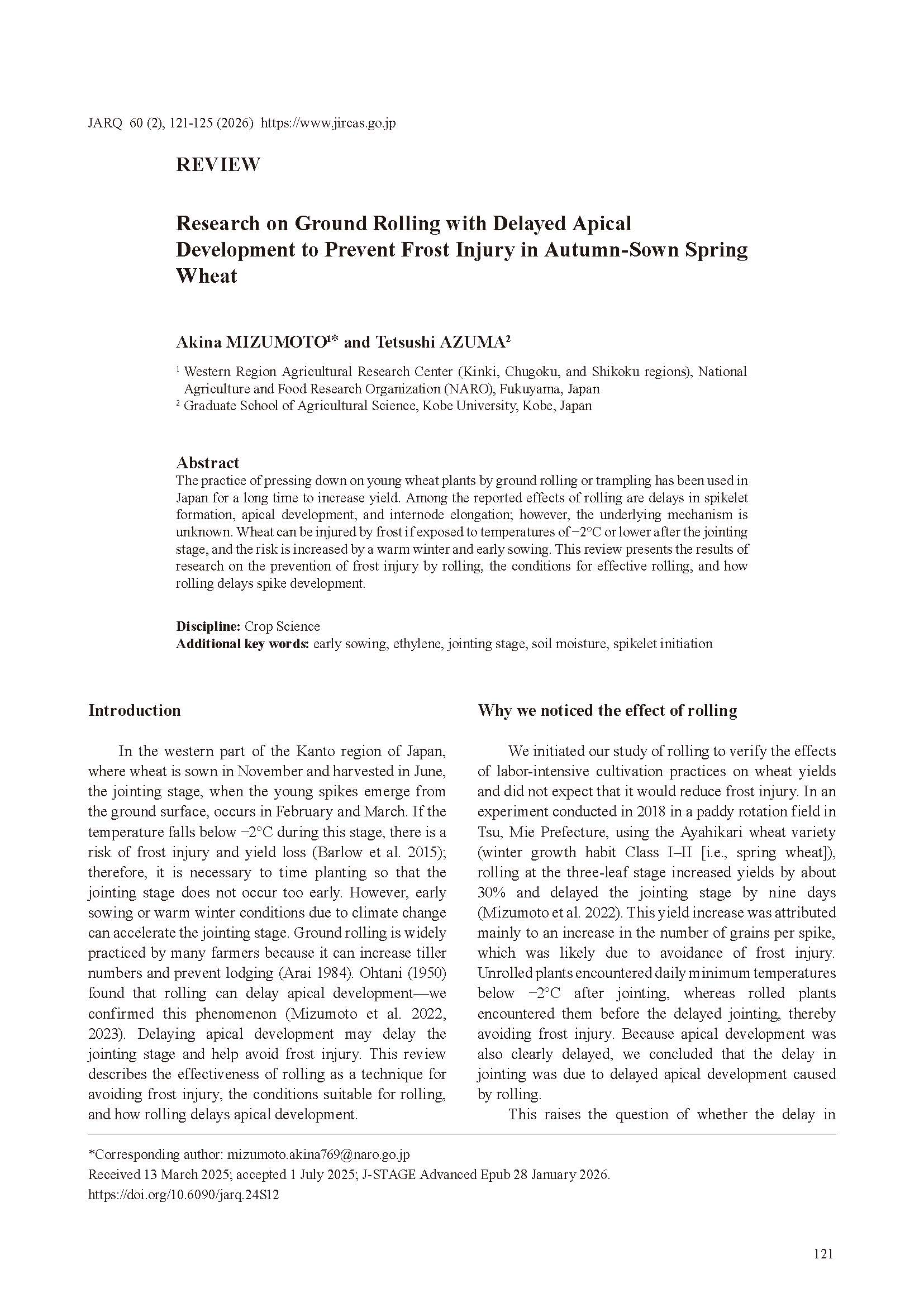 The practice of pressing down on young wheat plants by ground rolling or trampling has been used in Japan for a long time to increase yield. Among the reported effects of rolling are delays in spikelet formation, apical development, and internode elongation; however, the underlying mechanism is unknown. Wheat can be injured by frost if exposed to temperatures of −2°C or lower after the jointing stage, and the risk is increased by a warm winter and early sowing. This review presents the results of research on the prevention of frost injury by rolling, the conditions for effective rolling, and how rolling delays spike development.