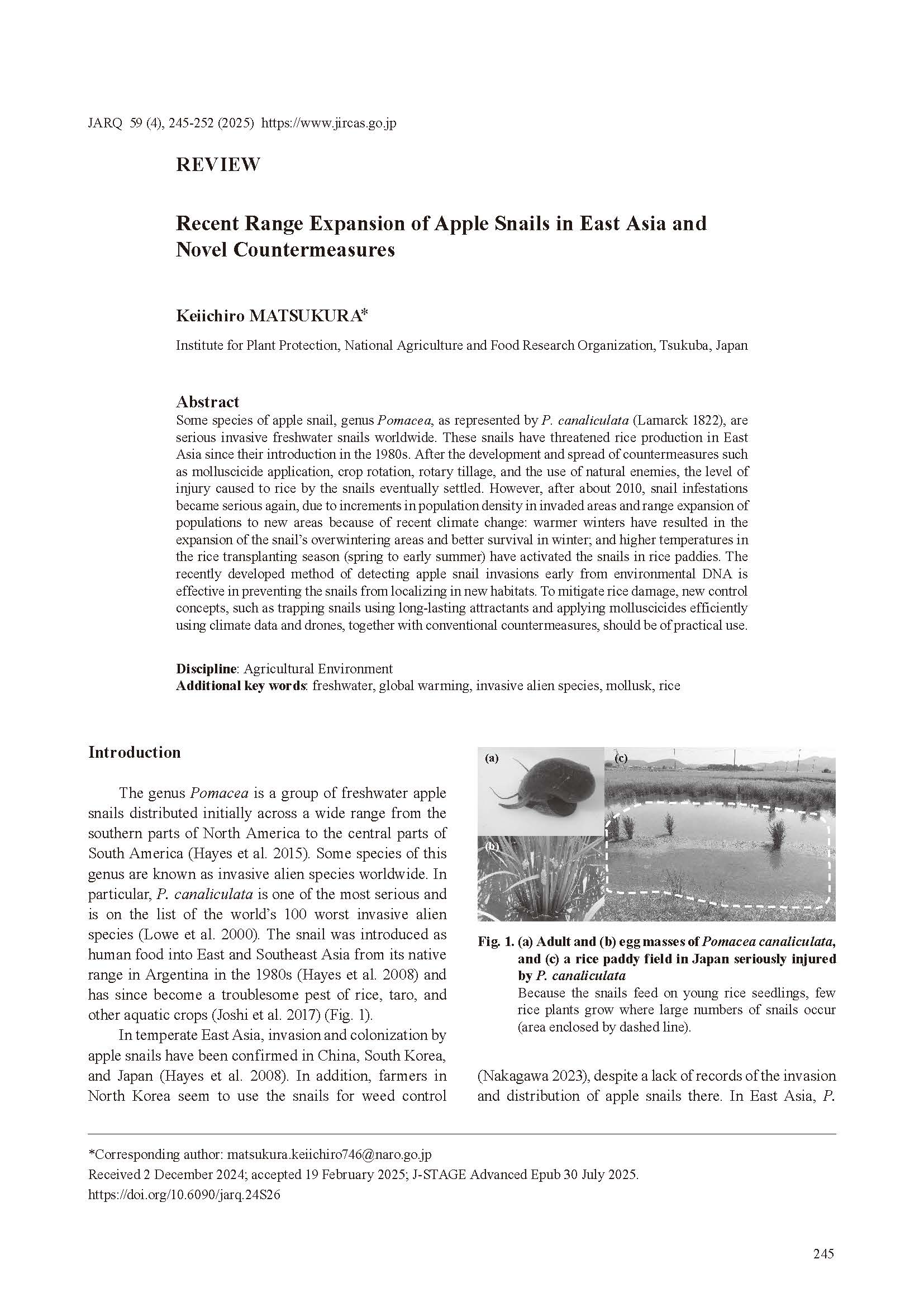 Some species of apple snail, genus Pomacea, as represented by P. canaliculata (Lamarck 1822), are serious invasive freshwater snails worldwide. These snails have threatened rice production in East Asia since their introduction in the 1980s. After the development and spread of countermeasures such as molluscicide application, crop rotation, rotary tillage, and the use of natural enemies, the level of injury caused to rice by the snails eventually settled. However, after about 2010, snail infestations became serious again, due to increments in population density in invaded areas and range expansion of populations to new areas because of recent climate change: warmer winters have resulted in the expansion of the snail’s overwintering areas and better survival in winter; and higher temperatures in the rice transplanting season (spring to early summer) have activated the snails in rice paddies. The recently developed method of detecting apple snail invasions early from environmental DNA is effective in preventing the snails from localizing in new habitats. To mitigate rice damage, new control concepts, such as trapping snails using long-lasting attractants and applying molluscicides efficiently using climate data and drones, together with conventional countermeasures, should be of practical use.