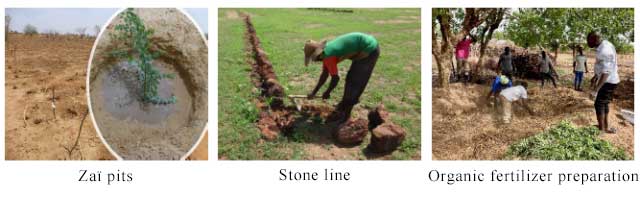 A traditional soil conservation technique that has long been used in the arid regions of West Africa. It involves digging holes about 30 cm in diameter and 20 cm deep, and placing seeds or seedlings in them along with compost. Originally, this technique was used to plant trees on degraded sloping land, but it later came to be used in fields as well. The small holes allow for the efficient collection and storage of rainwater, which helps prevent soil erosion while enhancing soil fertility through the addition of compost.