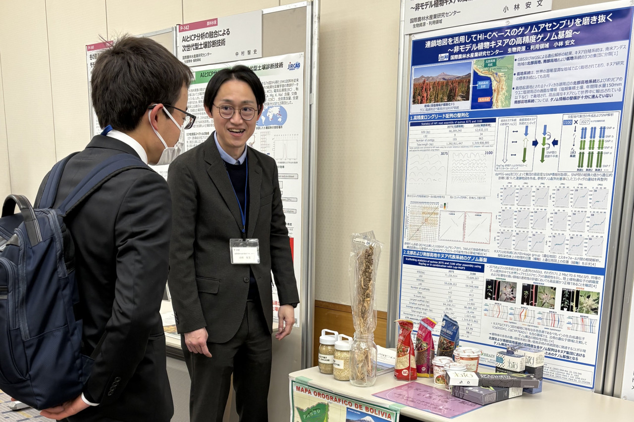 Additionally, Senior Researcher KOBAYASHI Yasufumi Kobayashi (Biological Resources and Post-harvest Division) gave a presentation titled “Refining Hi-C-Based Genome Assemblies Using Linkage Maps: High-Precision Genomic Resources for Non-Model Plant Quinoa,” in which he reported his research findings on the diversity and genomic foundations of quinoa inbred lines.