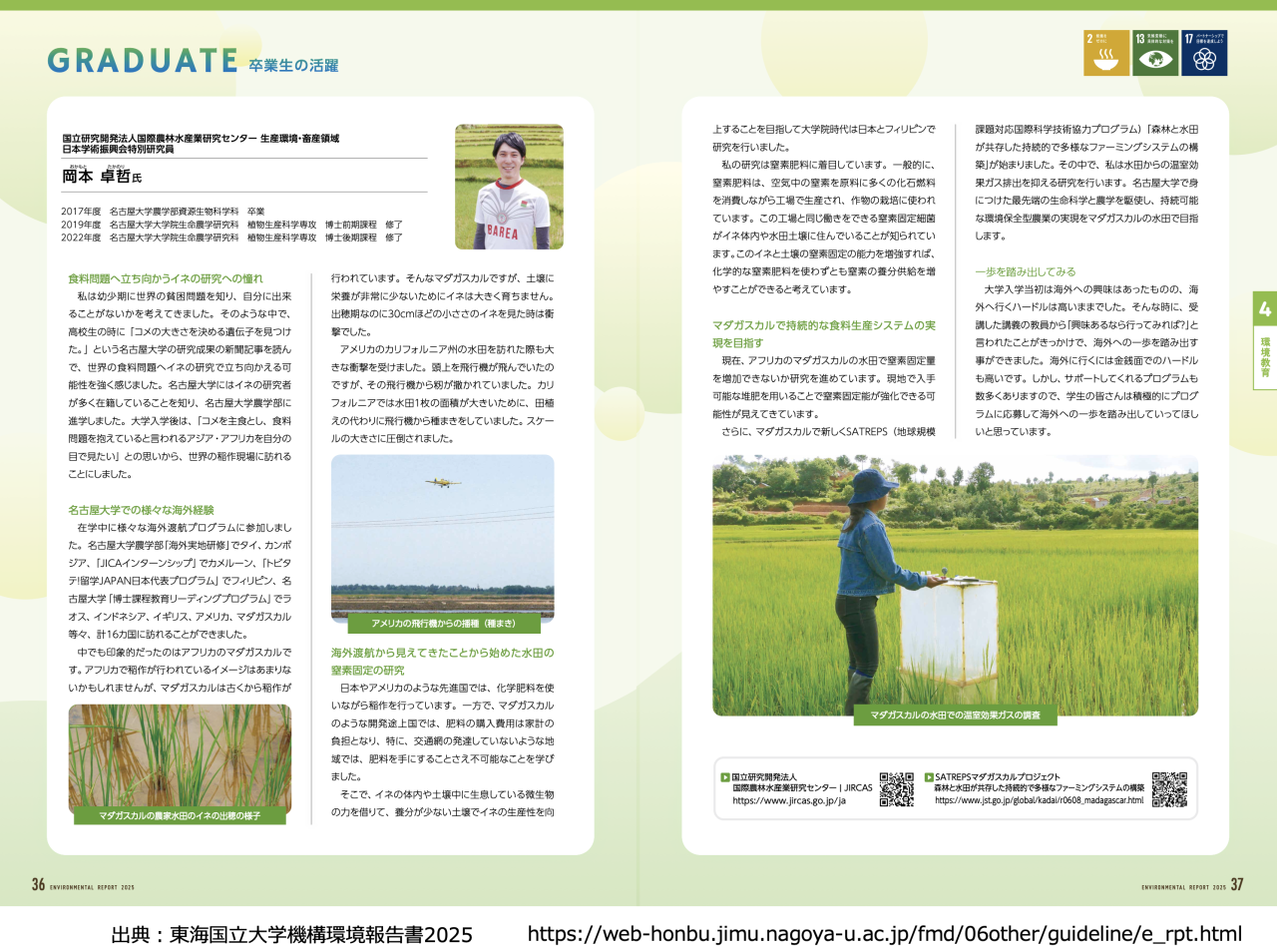 "Alumni Success Stories" (pp.36-37), Environmental Report 2025, Tokai National Higher Education and Research System