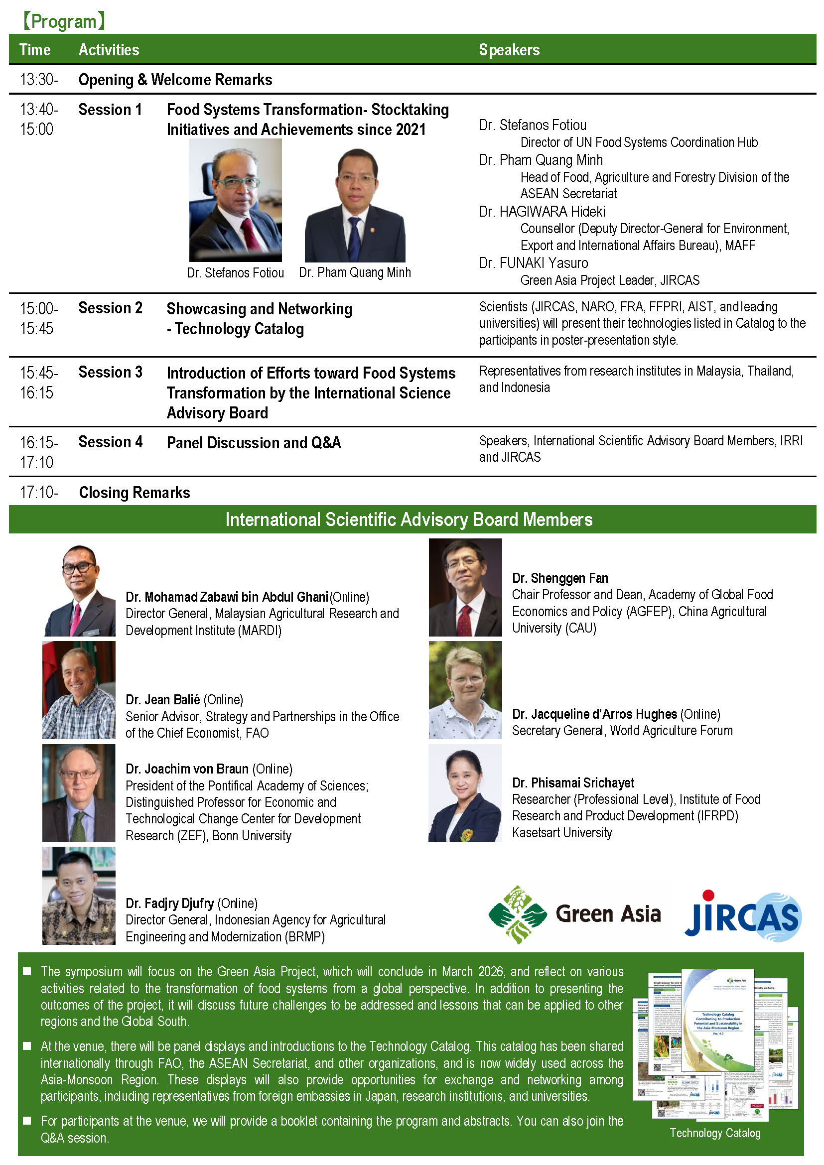 In all these times, the Japan International Research Center for Agricultural Sciences (JIRCAS) has been actively conducting the Green Asia Project, which ends in March 2026, in cooperation with many other research institutes in Japan and in the Asia-Monsoon region. Against this backdrop, the symposium will take stock of various activities in the transformation of food systems from a global perspective, with the focus on Green Asia project, in view of demonstrating their achievements and of identifying the lessons applicable to the other contexts.