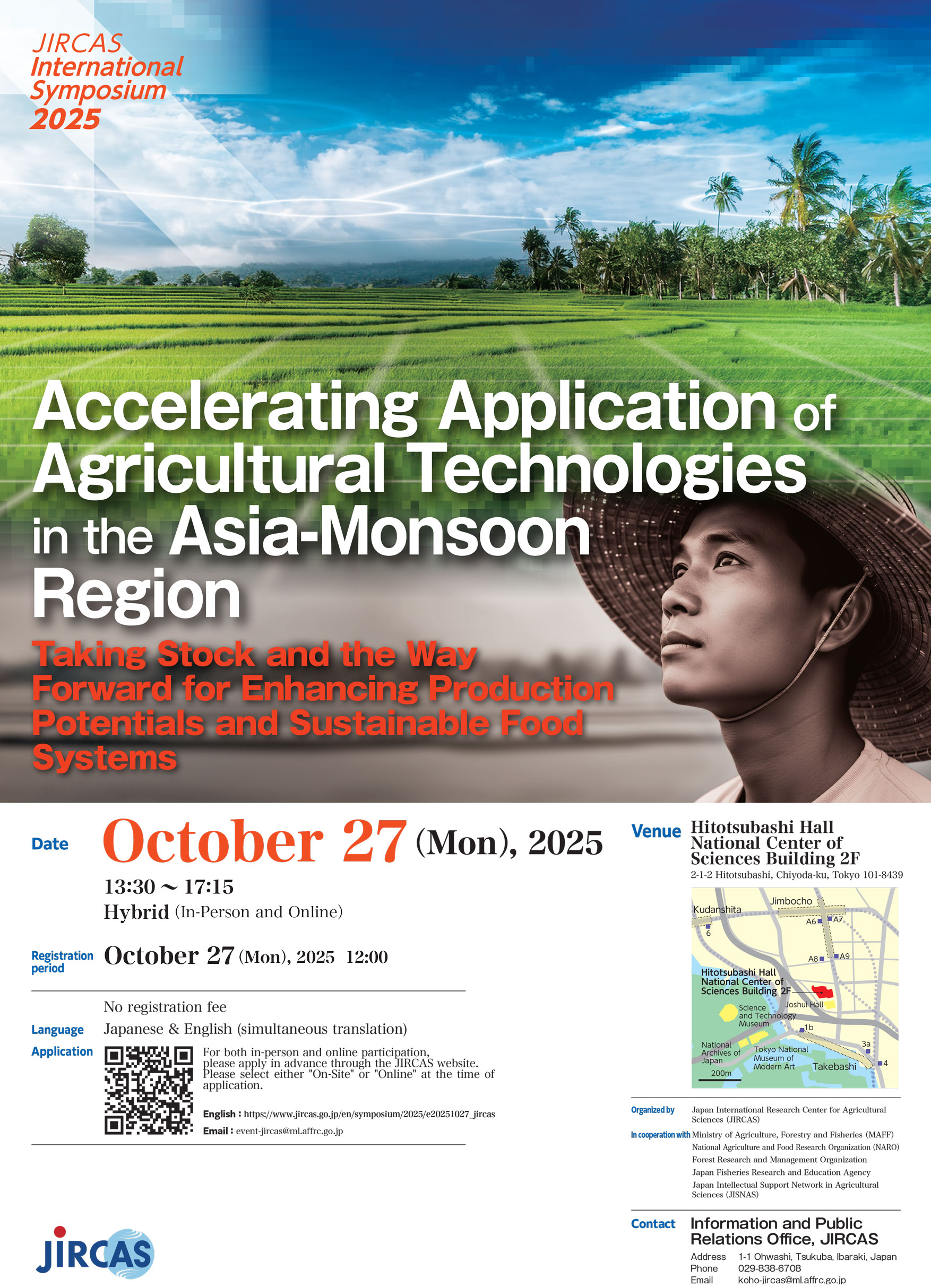 Information and Public Relations Office, JIRCASAddress1-1 Ohwashi, Tsukuba Ibaraki 305-8686 JapanTelephone+81-29-838-6708Registration deadline:(JST)Emailkoho-jircas@ml.affrc.go.jpNoticeFor participants at the venue, we will provide a booklet of the program and abstracts. You can also join the Q&A session.