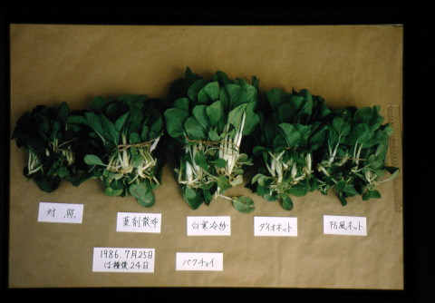 熱研プロジェクト「中国野菜」において、森下昌三らは中国の亜熱帯地域の夏野菜の不足を解消するため、キュウリについて当該地域の耐暑性、…乾燥地における複数列の混交防風林帯による微気象改良と作物