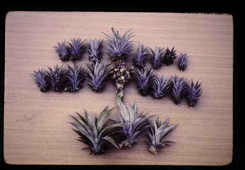 パインアップルについては、収集した品種・系統の諸形質を解析し、従来のカイエン、クィーン、レッドスパニッシュの3群に加えて、ブランコ、アマレロ、その他として台湾交配系統の6群に分類した。この研究は品種の系統関係の解明や交配組合せの選定に有益な知見を与えている。さらに、植物調節剤利用による増殖効率の向上、栄養系の組織培養による長期保存などの技術を開発している。最近では生食用優良品種の選定が重要課題となり、クィーン群、ブランコ群に有望な品種が見出されている。また、鑑賞用として有望な系統も見出されており、特性調査が進められている。このほか前述のギニアグラスのアポミクシス育種法の研究についても実施中である。