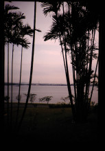 ジョホール水道。対岸はシンガポール、ピンロウジュらしい。ヤシの間から、夕方のシンガポールが見える。