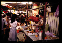 ケランタン州コタバルの市場。ニワトリのブロイラーを販売している。