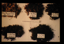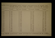 1985年から2000年までの茎葉(収穫の際に切り落とすものと、更新時のものとに分けられる)と幹の推定産出量。収穫時に切り落とされる茎葉の量は大きいが分散しているため、集めるのに多くの労力を必要としている(量的には多い)。更新時のものは一ヶ所で大量に得られる利点がある。