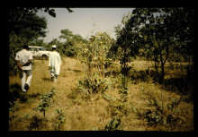 カドナ地方の乾燥地帯。ハードパンの上に20cm程の深さの表土があるが、根が浅く、植物の生育は悪い。樹木は4m 程、野草の根系は貧弱である。ナイジェリアにおけるILCA の亜湿潤プログラムのプロジェクトの一つとして、ここに牧草地を造成しようとしていたが、ハードパンにまで根系を拡げる適当な牧草を選定することが求められている。