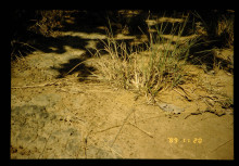 カドナ地方の乾燥地帯。ハードパンの上に20cm程の深さの表土があるが、根が浅く、植物の生育は悪い。樹木は4cm程、野草の根系は貧弱である。ナイジェリアにおけるILCA の亜湿潤プログラムのプロジェクトの一つとして、ここに牧草地を造成しようとしていたが、ハードパンにまで根系を拡げる適当な牧草を選定することが求められている。