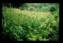 傾斜地農業の一つで、テラスの上に大豆を植え、岸にマメ科のカカワテを植えている。