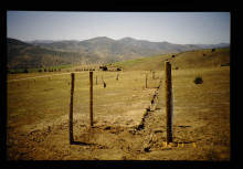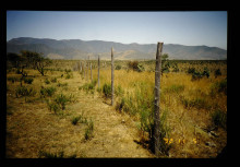 半乾燥地でユーカリやアカシアの植林試験を行っている。家畜に食べられるのを防ぐための柵で囲っている。外との差は明確である。