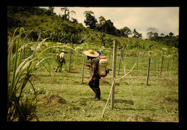 熱帯雨林の露地野菜栽培(病害防除作業) = Vegetable Cultivation In The Open Of The Tropical Rainforest Area (spraying Fungicide)