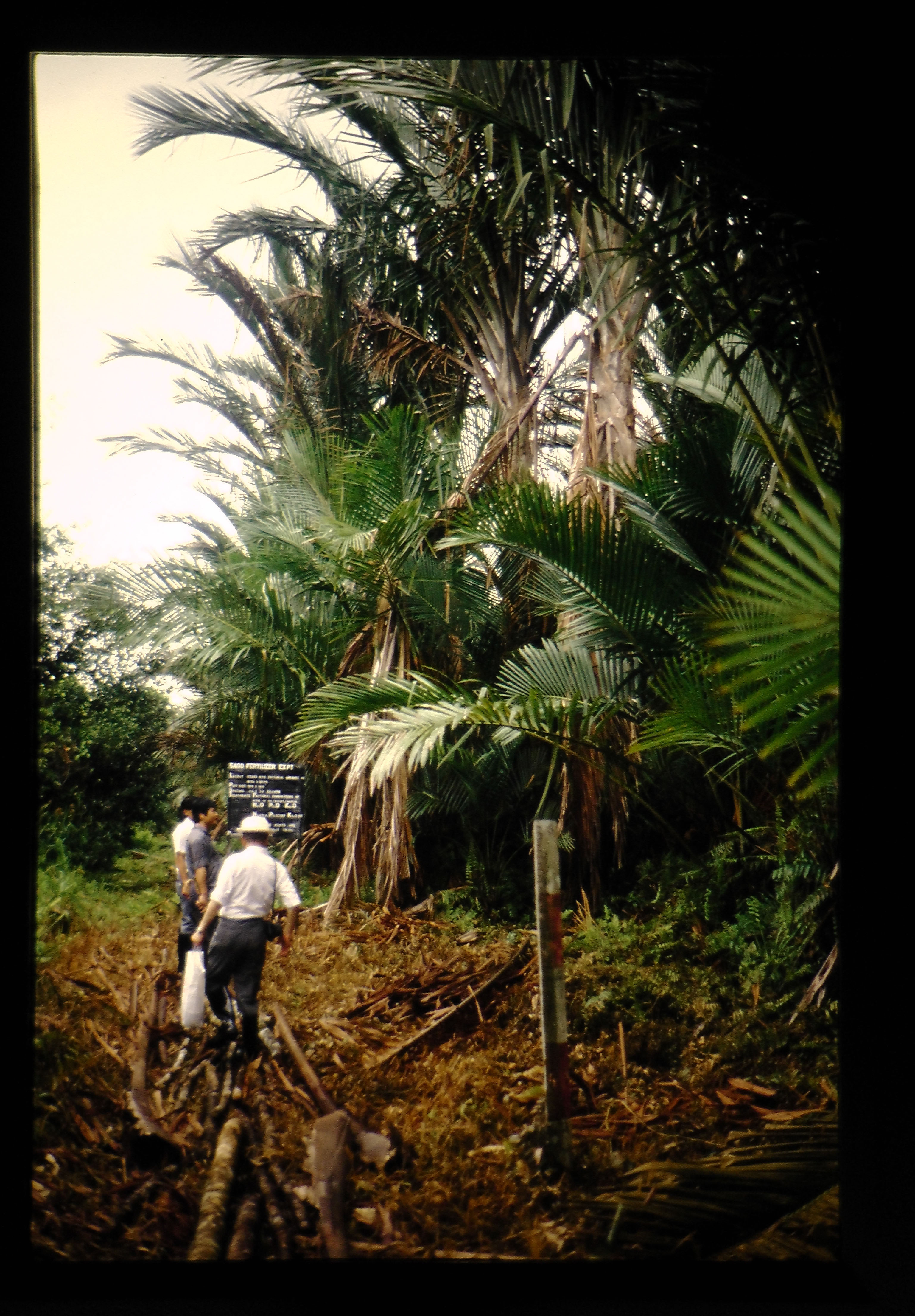 サラワク州クチン、スタポック厚層泥炭試験場。サラゴヤシの施肥試験園。熱帯泥炭低湿地では、その、土壌が強酸性(3-4)にもかかわらずサゴヤシがよく育ち、泥炭低湿地での重要なデンプン作物である。
