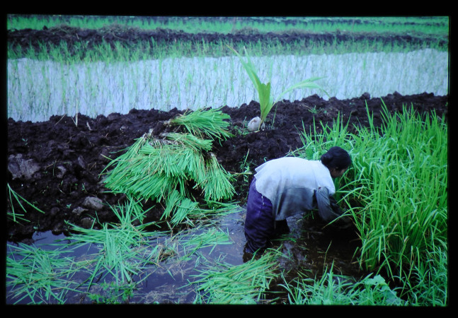 サカラグン入植地。水稲の本田への移植苗の準備。在来種では苗代播後二回苗代を変えて育苗し、三回目(写真)が本田移植である。高温下の大変な重労働である。