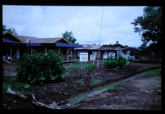 サカラグン入植地。入植地の中心。村長の住宅や集会場などがある。テレビも設置されている。近くに学校がある。