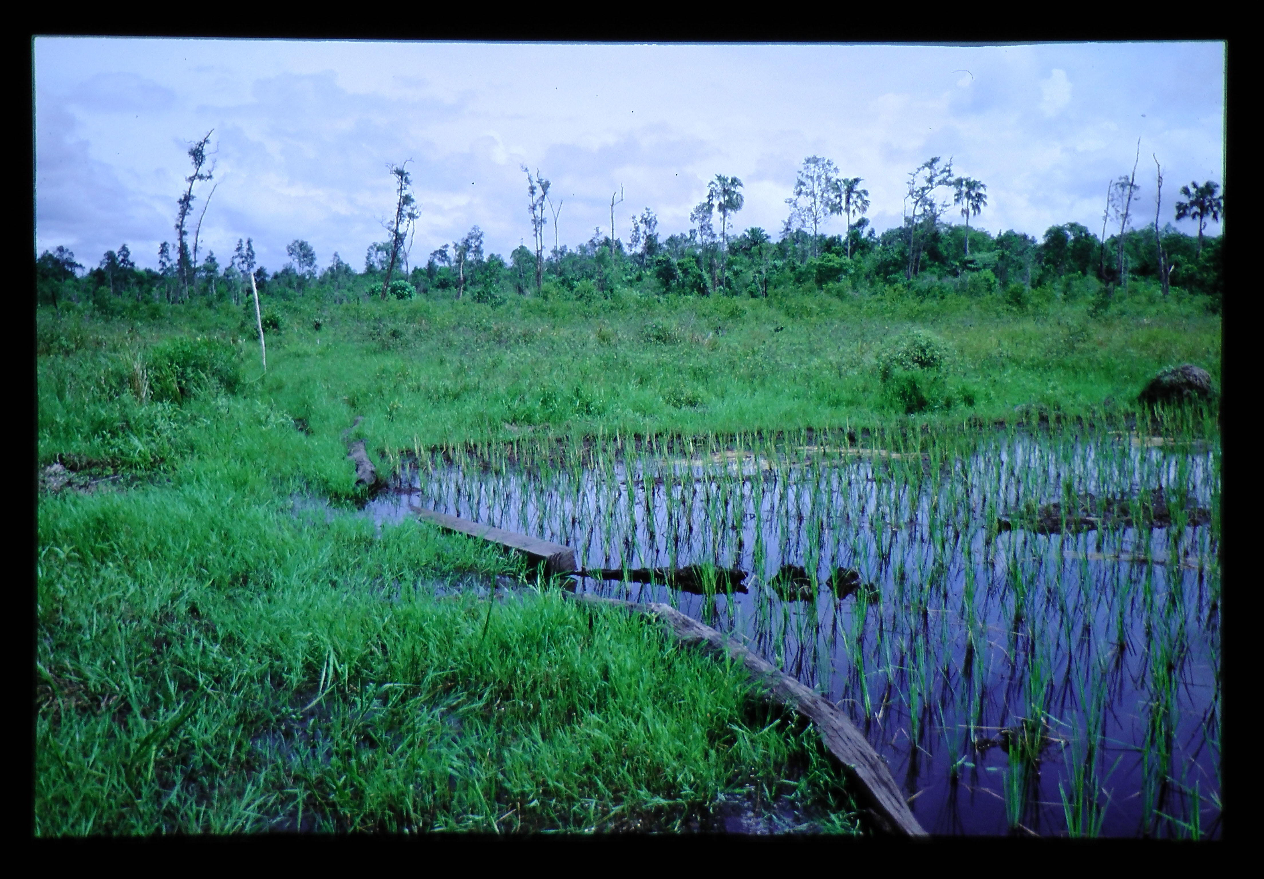 クプパテン開墾地。またも低湿地林寄りの新しく開墾され造成された小水田。開田初年から三年位のイネの生育はきわめて悪く、不稔もみられる。泥炭土壌の強酸性と泥炭から遊離するフェノール性有機物によるとされている。