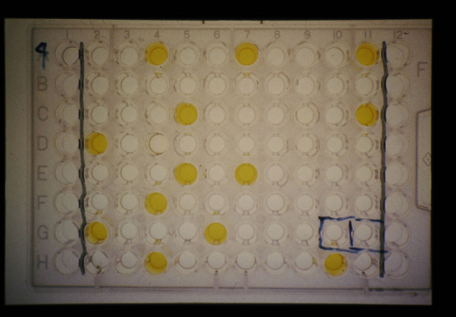 ELISA 法によるツングロ病源ウィルスの血清診断。黄色はプラスの血清反応で、ウィルス粒子が存在することを示す。
