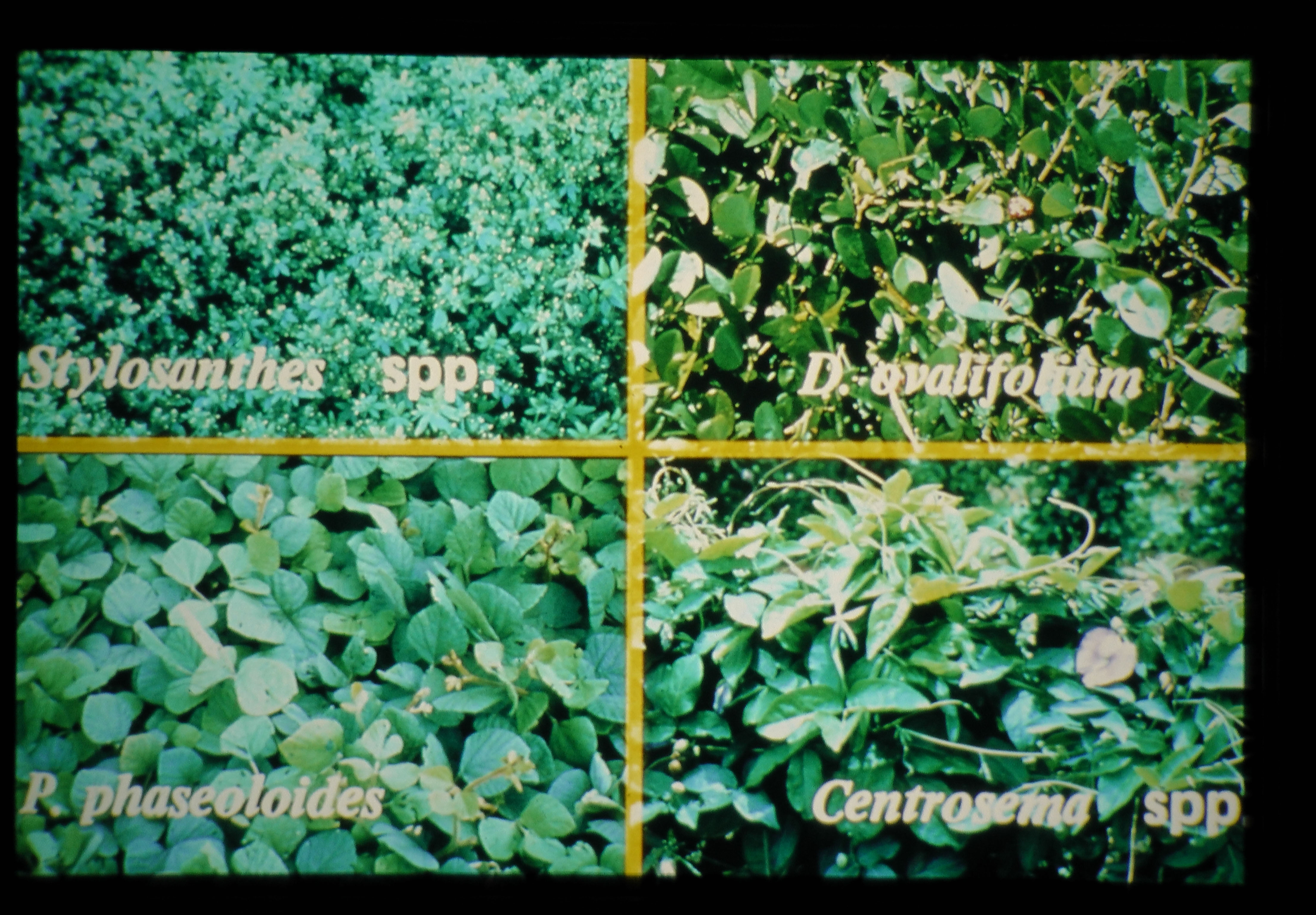CIAT の LEGUME PROGRAM はマメ科の多数の品種から、草地改良に好適の四種を選定した。 STYLOSANTHES SPP , DESMODIUM OVALIFOLIUM PUERARIA PHASEOLOIDES , CENTROCEMA SPP