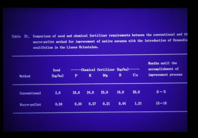 それに加え、86~88年に、小川はCIATで選抜された優良マメ科牧草の内でシードコーテッドボール法に最もよく適合する草種は Desmodiumで、播種床造成工法はチゼルプラウー回がけによる帯状の部分耕起法が実用的であった。シードコーテッドボール法によってマメ科牧草が高い定着率を示すことが認められ、リャノスの保全機能が高く、牧草種子及び施肥量の節減による低コストの草地造成法確立の可能性が確かめられた。今後は造成された広範囲の放牧地において、本格的な肉牛の放牧による栄養給与面からの評価を行っていく事になろう。