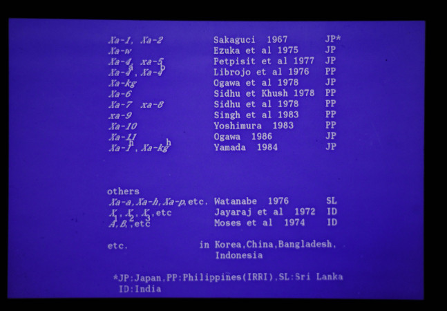 日本、IRRI、等で独立に命名された。BLB 対抗性遺伝子記号が並記されている。