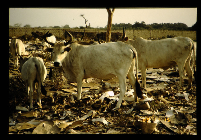 ホワイトフラニの放牧、ダンボール捨て場で紙を食べている。かなりな粗食である。中には、ホワイトフラニとンダマの交雑種が見られる。体に印を付け、所有数を現わしている。