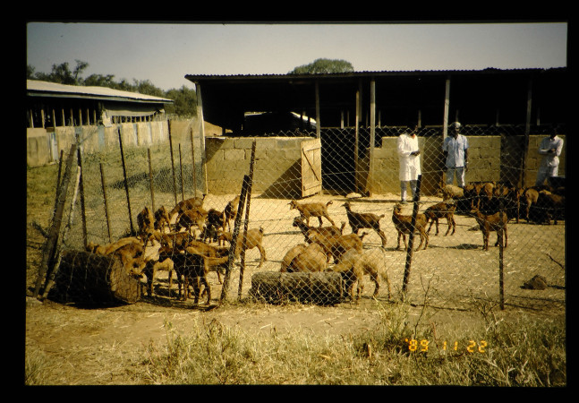 シカの畜産試験場で見た山羊、白色の山羊の品種は分からない。山羊はWEST AFRICAN DWORF GOATと思われ、トリパノゾーマ症に耐性を持つ。