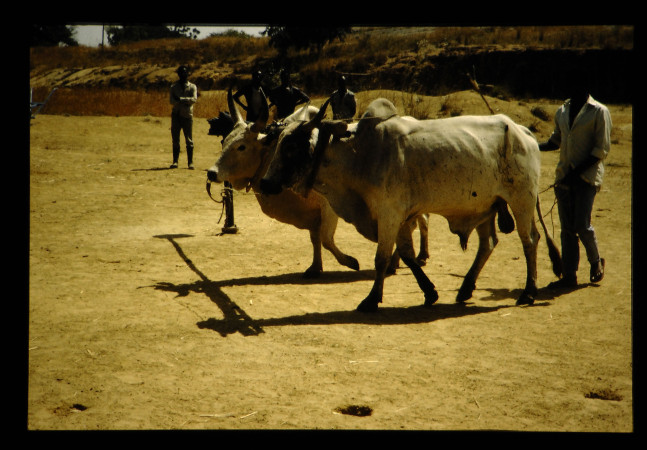 インランドバレーの風景、ナイジェリアの 7%を占める。雨期に水が豊富である。この地形での農業の振興のために、牛を役畜に用いて労力の軽減を計る計画で、牛の訓練を行っている。インランドバレーでは、稲作も行われているが、トリパノゾーマやその他の病気、寄生虫病も多いことが難点である。