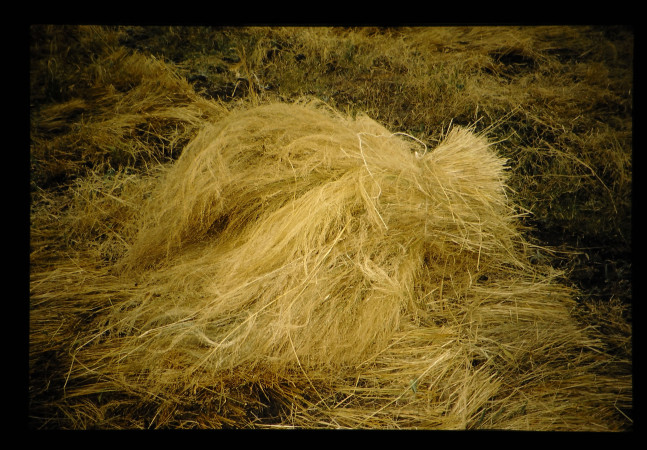 テフの栽培と収穫。刈り取ったテフを束ねて、牛に踏ませて脱穀する。テフはエチオピアの主要穀実作物、粉を発酵させインジェラにして食べる。