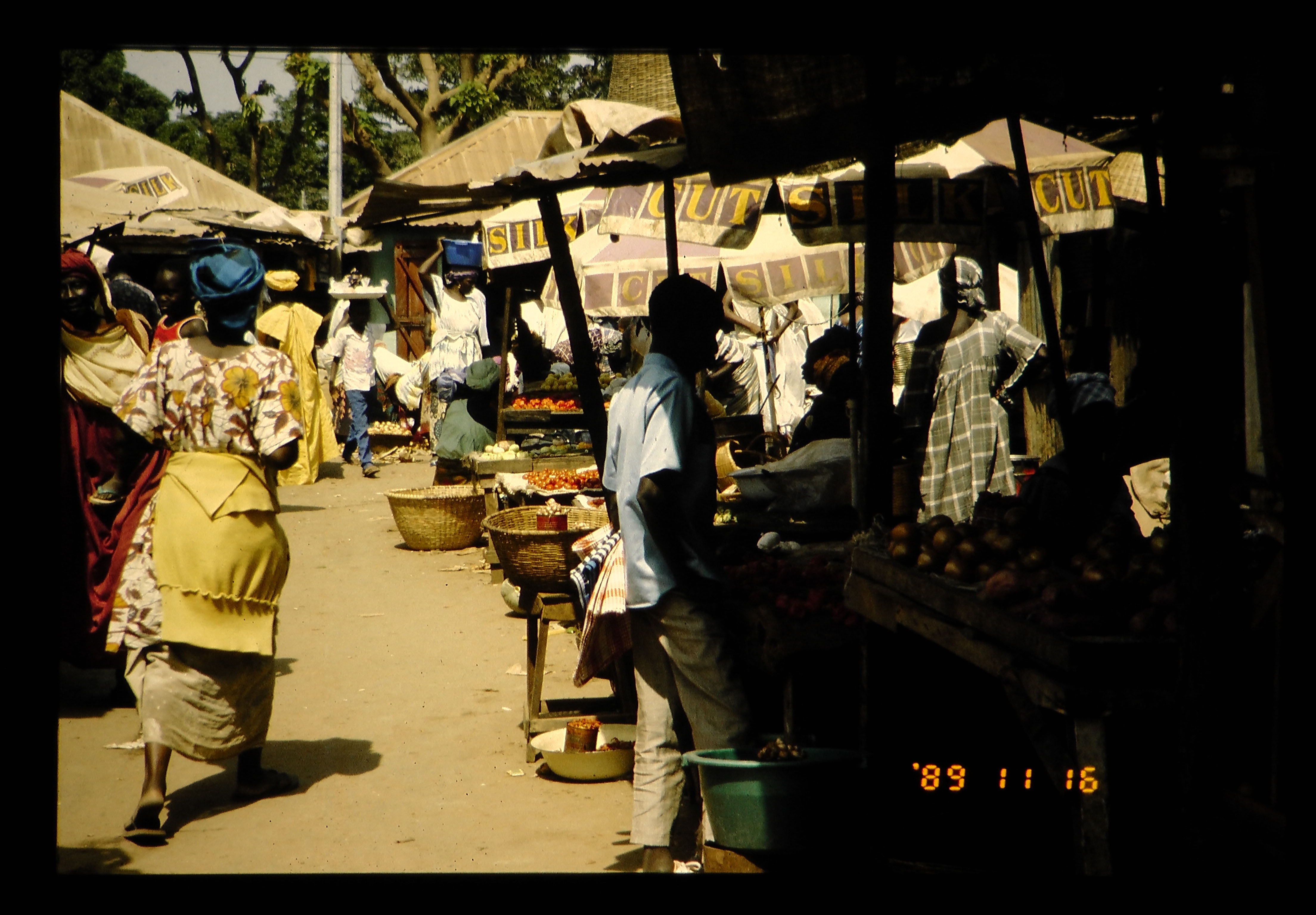 ガンビアの首都バンジュールのマーケット。食料、衣料類、その他を販売している。魚のクンセイ、枕型のカボチャ等、興味はつきない。
