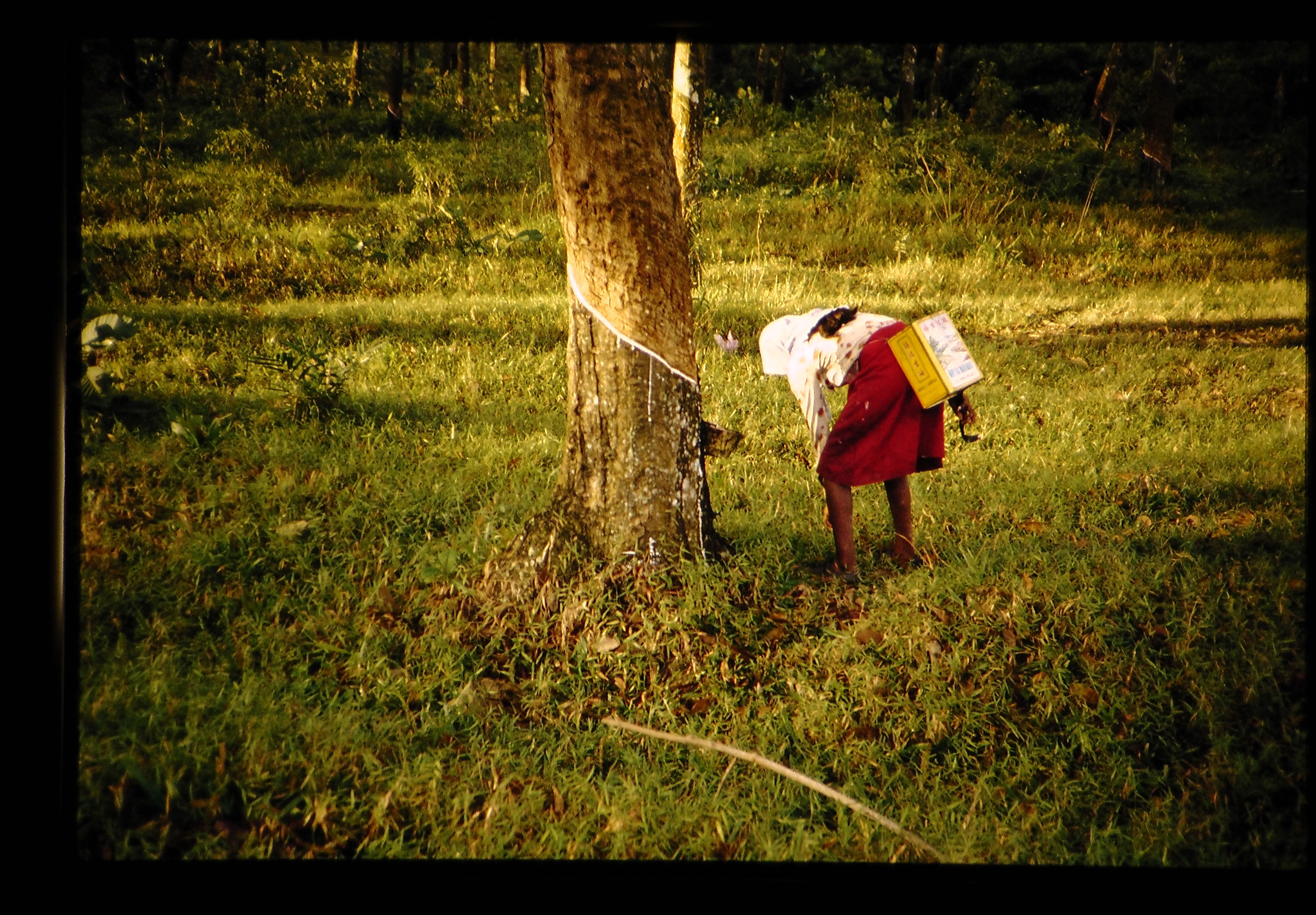 ゴムのタッピングと採集、ゴム樹液は二日毎に一度集めるとのこと。