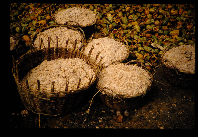 採り出されたカカオビーンをカゴに集めたところ。カカオ豆は最初は白いが、時とともに色変わりする。