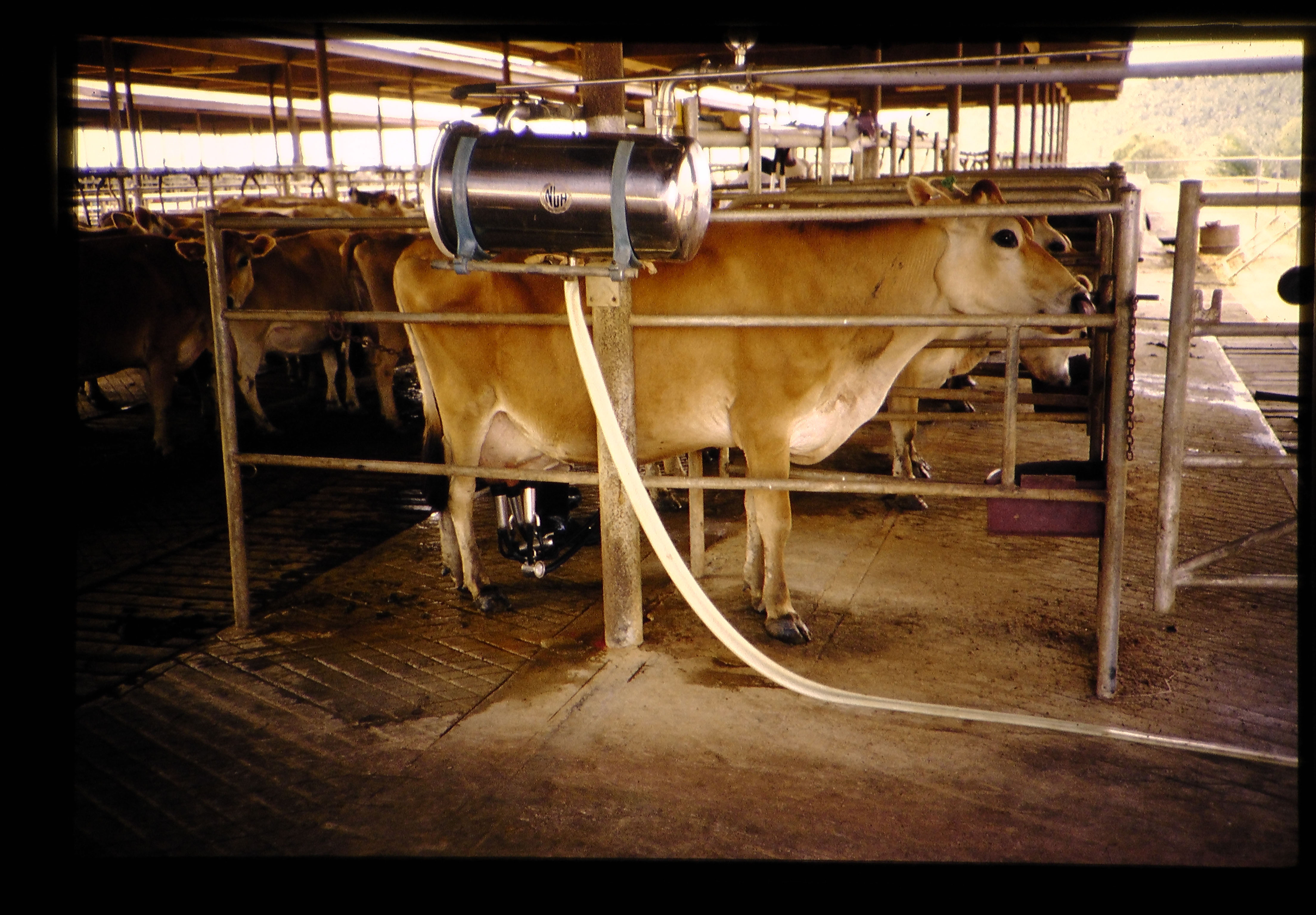 MARDIクルアン試験場のジャージー種、簡単な窓の無い牛舎に収容。ミルキングパラーで授乳中。
