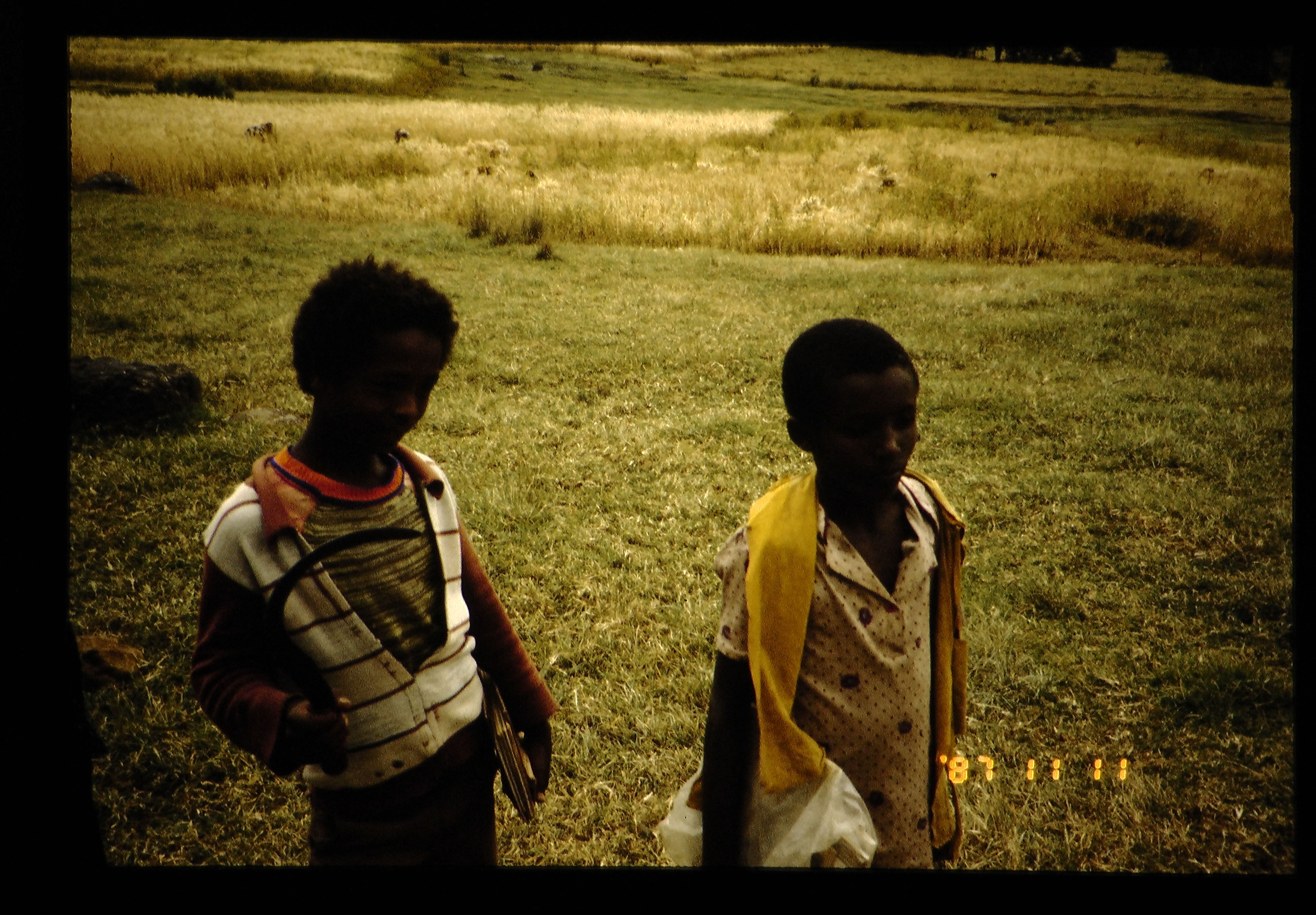 アムハラ族の子供、学校帰りか?後方はテフの畑、鎌でテフを収穫している。