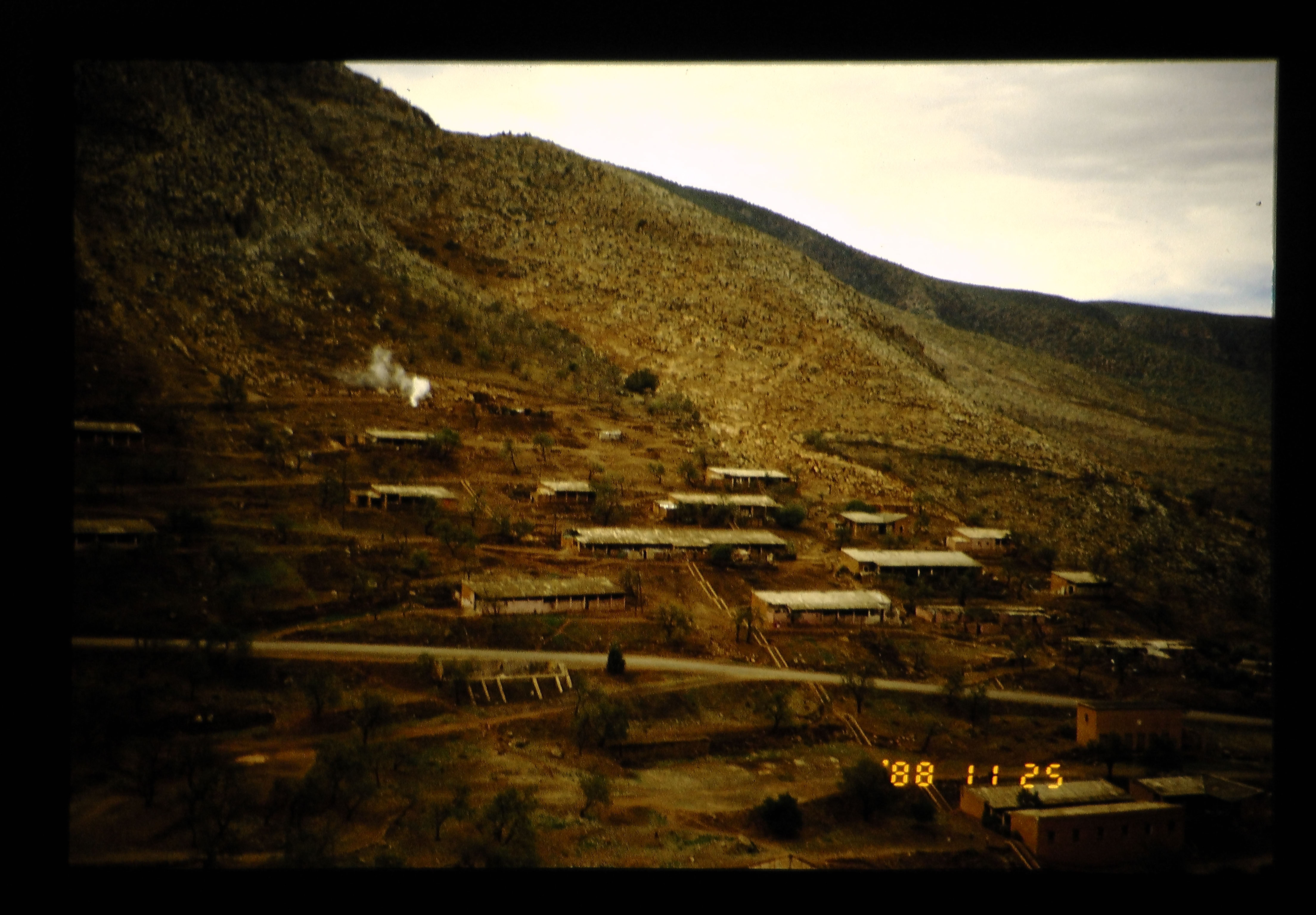 アトラス山系のベルベル人の住居。斜面に住み、谷に添った低地を畑にしている。