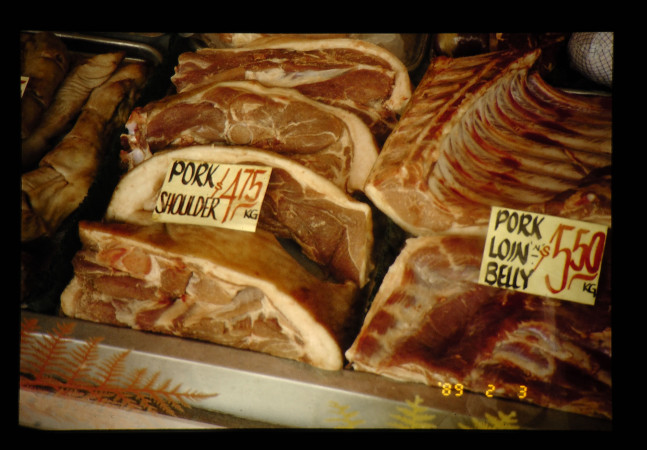 スパ市内の肉やの店頭で見かけた、豚肉の切身。背脂肪が薄く、赤身が多い唯、きちんと冷蔵していないので、痛みが速いようであった。