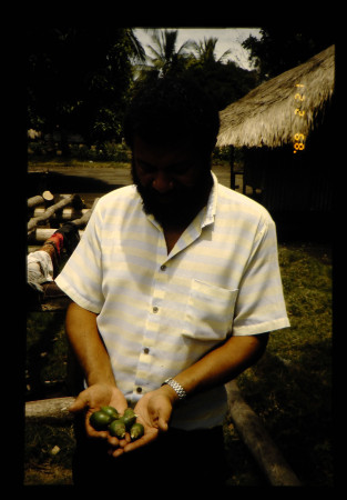 ビートルナッツ、ビンロウジの実。実を石灰、マスタードと共に噛むと口の中が真っ赤になる。非常に刺激的な辛い味がする。