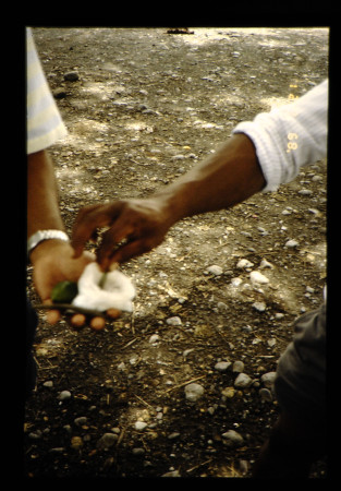 ビートルナッツ、ビンロウジの実。実を石灰、マスタードと共に噛むと口の中が真っ赤になる。非常に刺激的な辛い味がする。