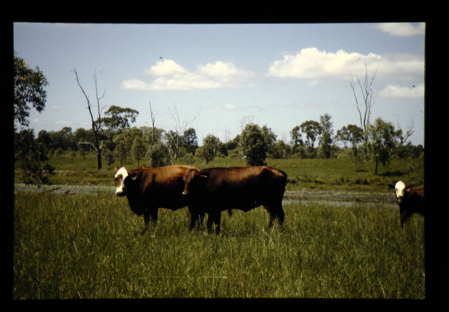 ベルモントレッド、体色はアフリカンダーの影響で赤いが、ヘレフォードの影響で顔面が無いものもある。