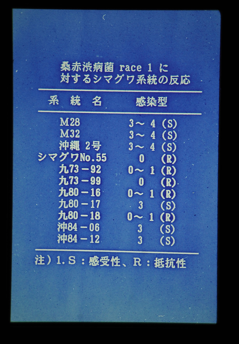 接種検定により、クワ赤渋病に対し抵抗性の5系統を選定することができた。これら5系統のうち、九73-92、九73-99については多収性であることが明らかにされており、南西諸島において適用性の高い系統と推察される。