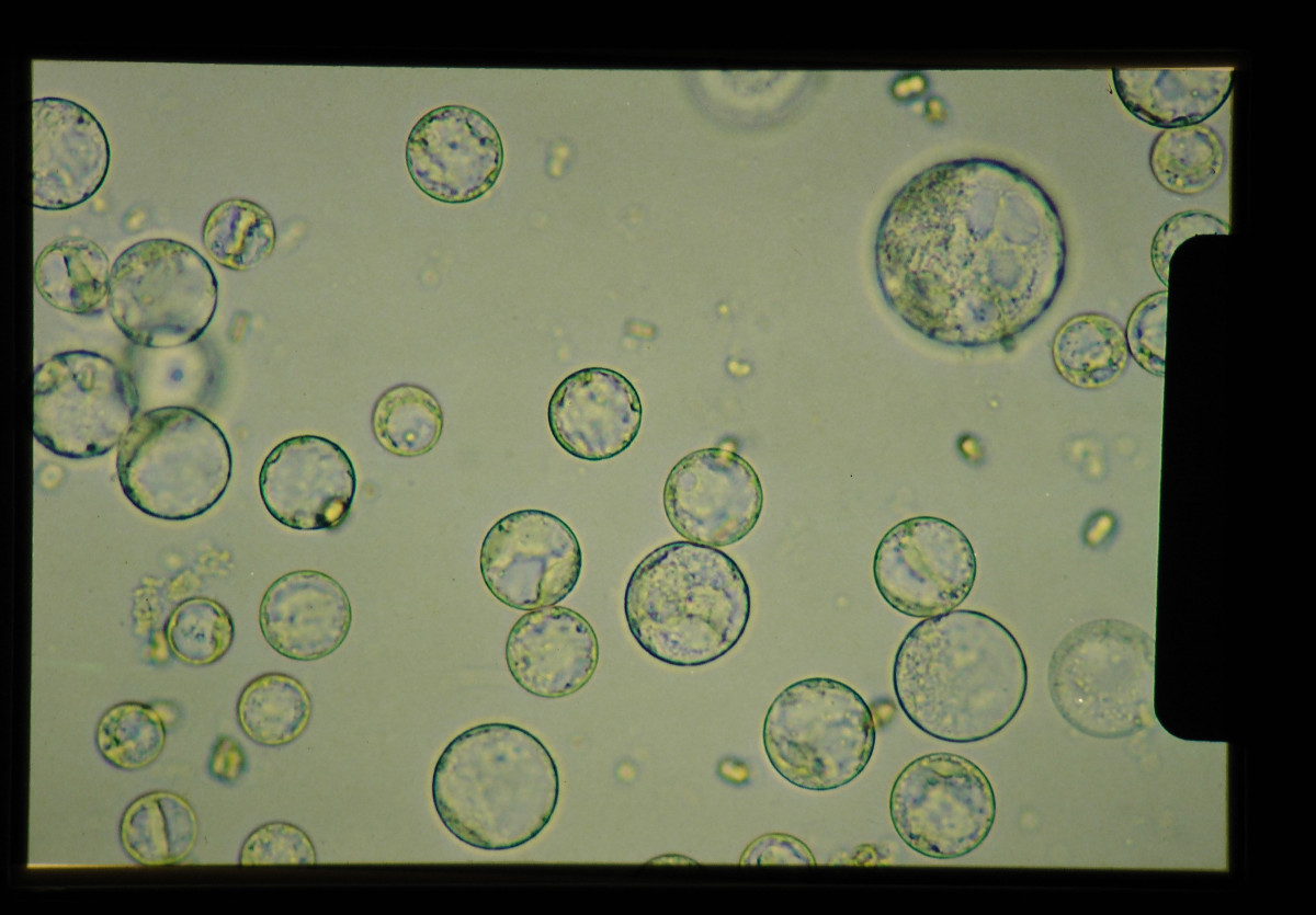 単離され培養液中に懸濃されたプロトプラスト。