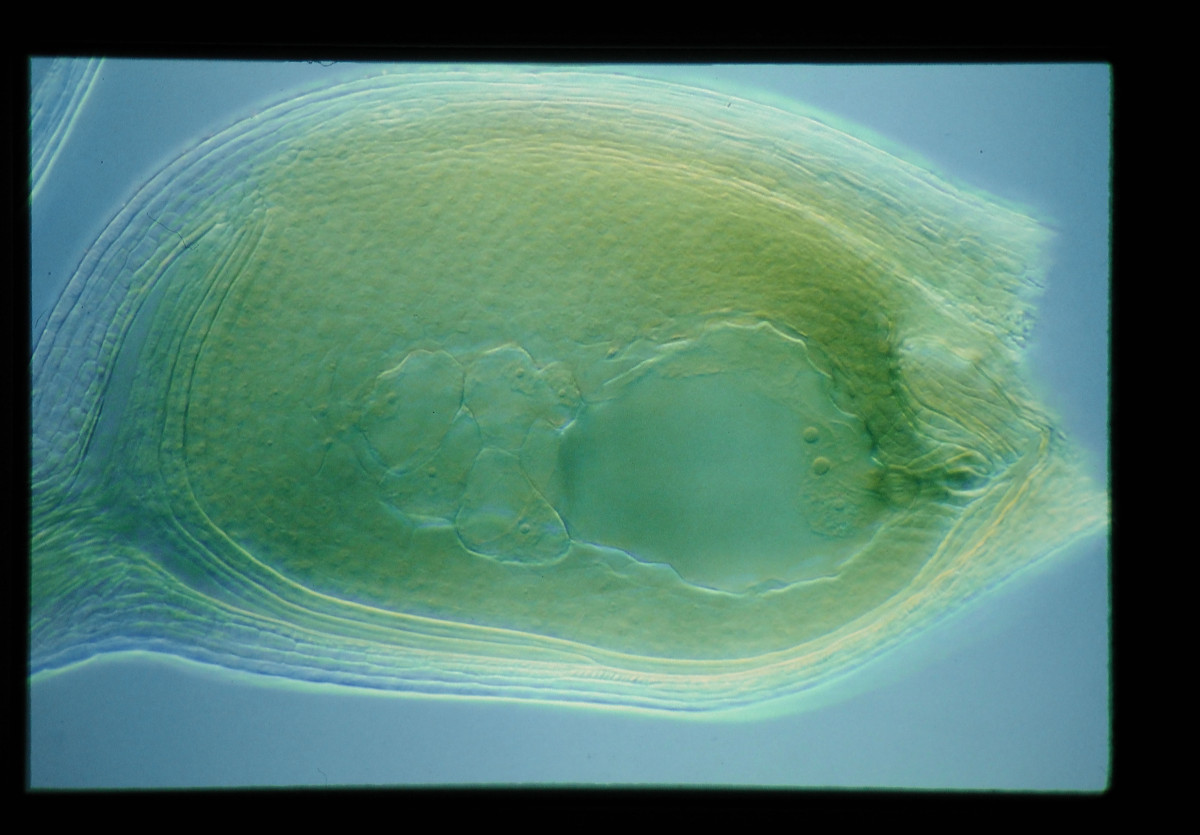 有性生殖胚(透明化法)。サリチル酸メチル法で透明化して、ノマルスキー微分干渉顕微鏡で観察するとパラフィン切片法と同様の像が観察される。