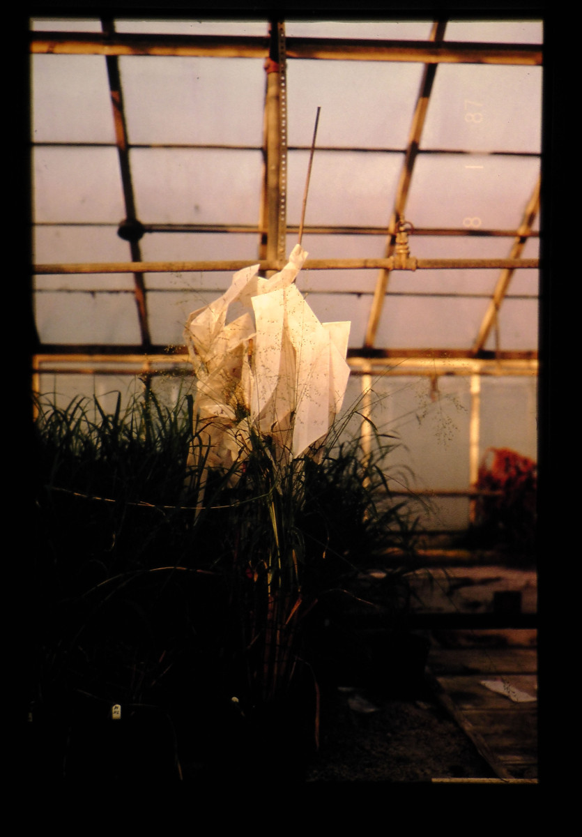 パラフィン袋に花粉を集め、隔離温室内で袋掛けによる交配を行っているところ。プラスチックバック法の後に交配すると、ほぼ100%の雑種個体が得られる。