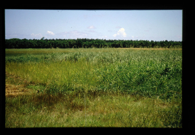 「ギニアグラスと熱帯マメ科牧草の混植」 手前の右半分の葉色の濃いところは、サイラトロとギニアグラスの混色区でギニアグラスの葉色が濃く、左半分はギニアグラスの草播区であり葉色が淡い。